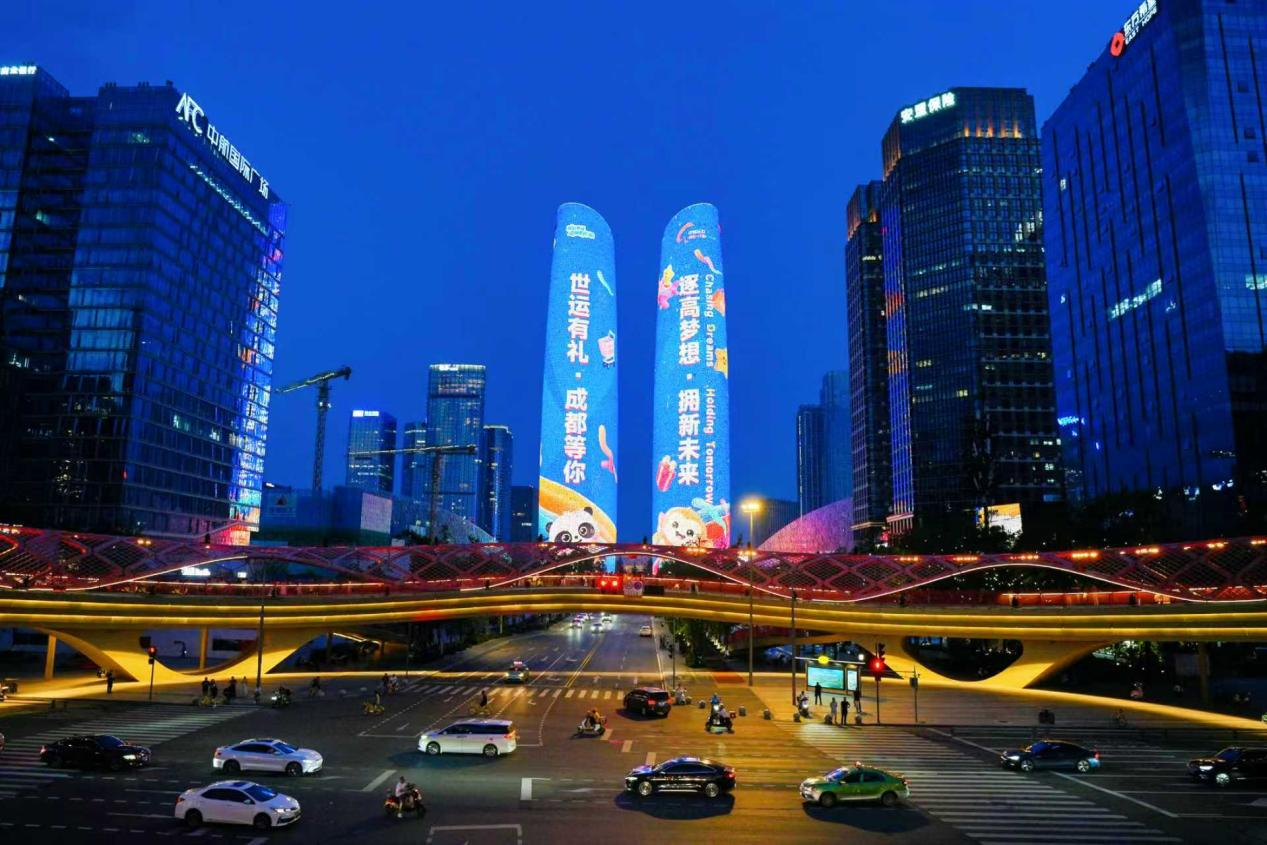 除了巨幅数字长屏“天府大屋檐”,位于成都高新区交子大道、高218米的“封面地标”——天府双塔的“光影外衣”也由京东方打造。其外立面金属框架采用京东方全球领先的显示技术,由京东方定制的LED金属灯条屏组成,灯条长度达16.2万米,屏幕面积达到52000平方米,实现800万像素点的高清显示。夜间,天府双塔变身巨大屏幕,主题光影秀科技感与时尚感交融,点亮城市夜空,形成流光溢彩、璀璨夺目的视觉盛宴。